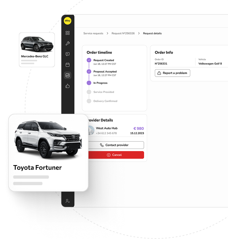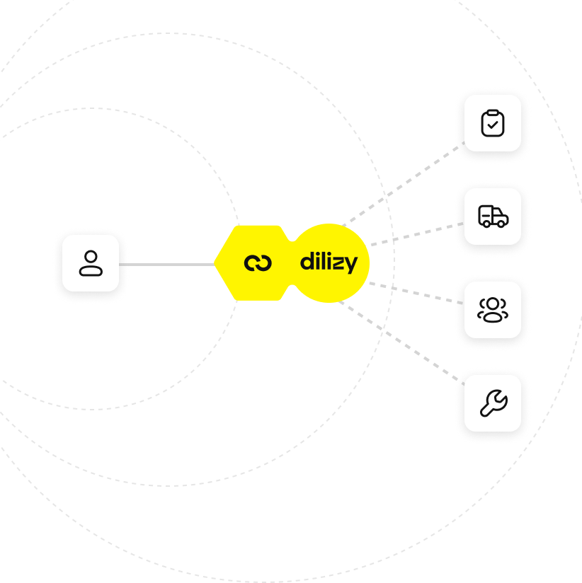 Перевізники приймають замовлення, оновлюють статус і завантажують документи з мобільного застосунку Dilizy. Дилери стежать за кожним авто в дорозі з того самого панелі, де керують інвентарем.